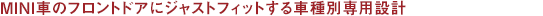 *SonicPLUSのMINI車専用モデルはすべてフロント専用で、リア専用機種は設定しておりませんが、ご希望によりソニックデザイン製品取扱認定店(弊社認定のカーオーディオ専門店)がリアスピーカーのカスタムインストレーション(取り付け)を承ります。詳しくは最寄りのソニックデザイン製品取扱認定店、または直接弊社へお訊ねください。